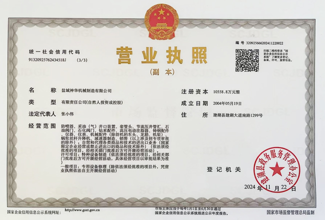 鹽城神華機(jī)械制造有限公司為中國石油、石化、海洋物資裝備(集團(tuán))總公司的網(wǎng)絡(luò)成員單位,公司注冊資金10558.8萬元整,公司通過了ISO9001國際質(zhì)量體系認(rèn)證,取得了中國船級社船舶產(chǎn)品和配件使用證書。